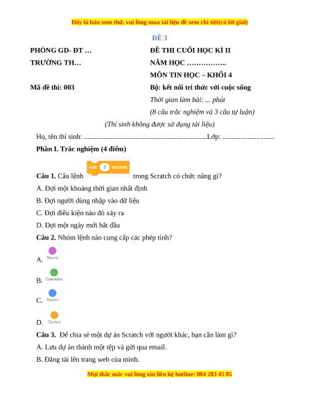 MÔN TIN HỌC – KHỐI 4 Mã đề thi: 003