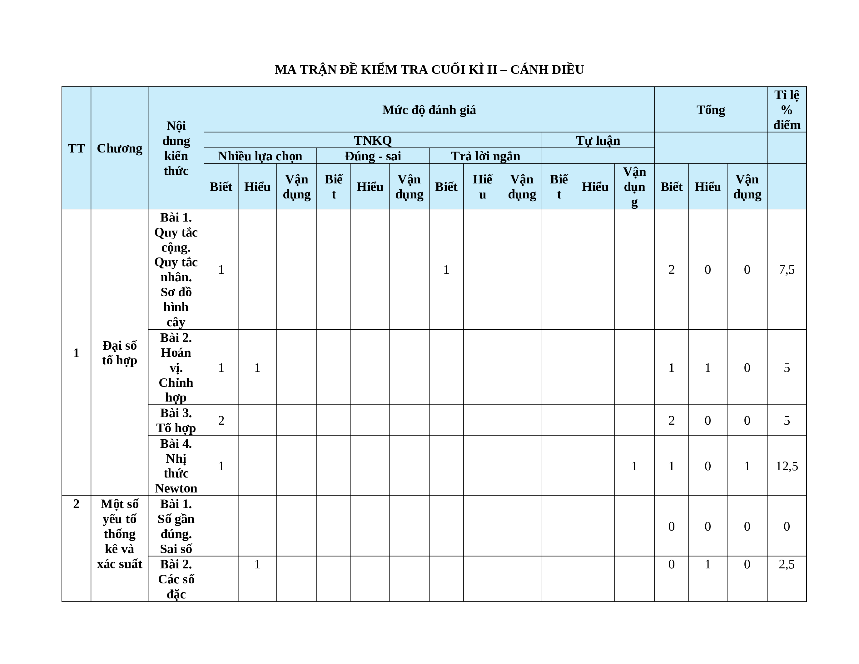 MA TRẬN ĐỀ KIỂM TRA CUỐI KÌ II – CÁNH DIỀU Tỉ lệ Mức độ đánh giá Tổng % Nội điểm dung TNKQ Tự luận TT Chương kiến Nhiều lựa chọn Đúng - sai Trả lời ngắn thức Vận Vận Biế Vận Hiể Vận Biế Vận Biết Hiểu Hiểu Biết Hiểu dụn Biết Hiểu dụng t dụng u dụng t dụng g Bài 1. Quy tắc cộng. Quy tắc 1 1 2 0 0 7,5 nhân. Sơ đồ hình cây Bài 2. Đại số 1 Hoán tổ hợp vị. 1 1 1 1 0 5 Chỉnh hợp Bài 3. 2 2 0 0 5 Tổ hợp Bài 4. Nhị 1 1 1 0 1 12,5 thức Newton 2 Một số Bài 1. yếu tố Số gần 0 0 0 0 thống đúng. kê và Sai số xác suất Bài 2. 1 0 1 0 2,5 Các số đặc trưng đo xu thế trung tâm cho mẫu số liệu không ghép nhóm Bài 3. Các số đặc trưng đo mức độ phân 1 0 1 0 5 tán cho mẫu số liệu không ghép nhóm Bài 4. Xác suất của biến cố trong một số trò chơi đơn giản Bài 5. Xác suất 1 2 2 1 1 2 3 22,5 của biến cố 3 Phương Bài 1. pháp Tọa độ tọa độ của trong vectơ mặt Bài 2. phẳng Biểu 1 1 1 0 1 7,5 thức tọa độ của các phép toán vectơ Bài 3. Phương trình 2 1 2 1 0 7,5 đường thẳng Bài 4. 1 1 1 1 0 5 Vị trí tương đối và góc giữa hai đường thẳng. Khoảng cách từ một điểm đến một đường thẳng Bài 5. Phương trình 1 1 2 0 0 7,5 đường tròn Bài 6. Ba 1 1 1 1 0 12,5 đường conic Tổng số câu 10 2 0 2 4 2 2 1 1 0 1 2 Tổng số điểm 3,0 2,0 2,0 3,0 4,0 3,0 3,0 10 Tỉ lệ % 30 20 20 30 40 30 30 100 Lưu ý: