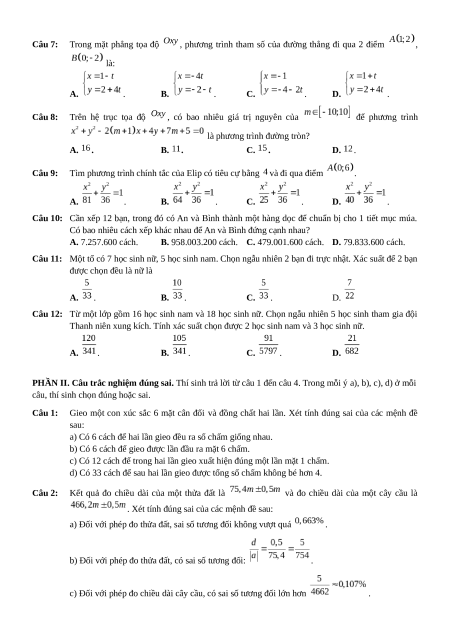 (Mỗi câu trả lời đúng thí sinh được 0,25 điểm) Câu 1 2 3 4 5 6 7 8 9 10 11 12 Chọn B C C A D C D C D D D A PHẦN II.