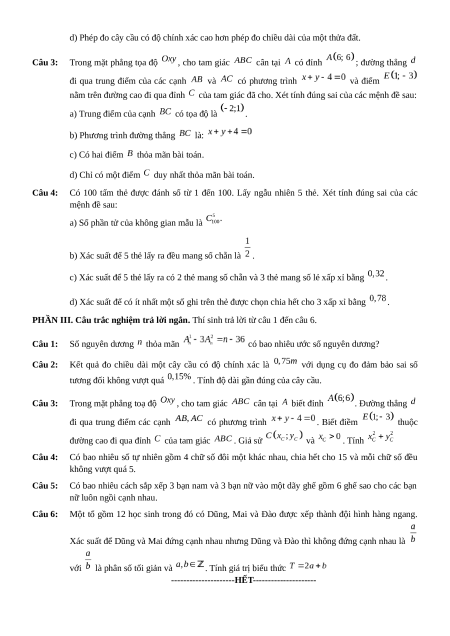 PHẦN III. Câu trắc nghiệm trả lời ngắn. Thí sinh trả lời từ câu 1 đến câu 6. Câu 1: