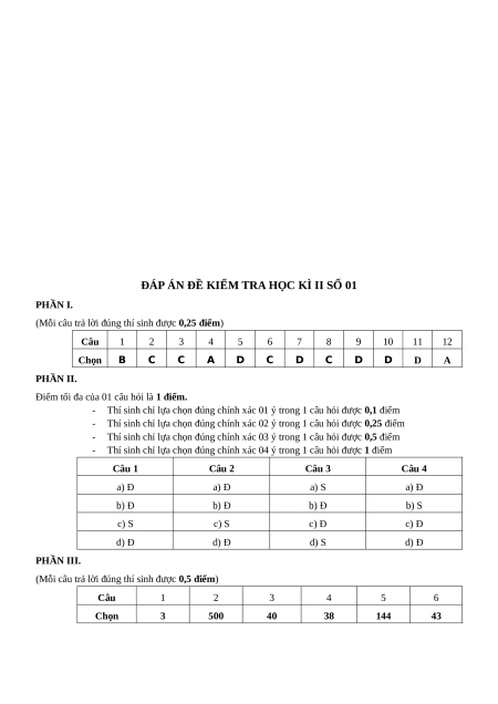 ĐÁP ÁN ĐỀ KIỂM TRA HỌC KÌ II SỐ 01 PHẦN I.