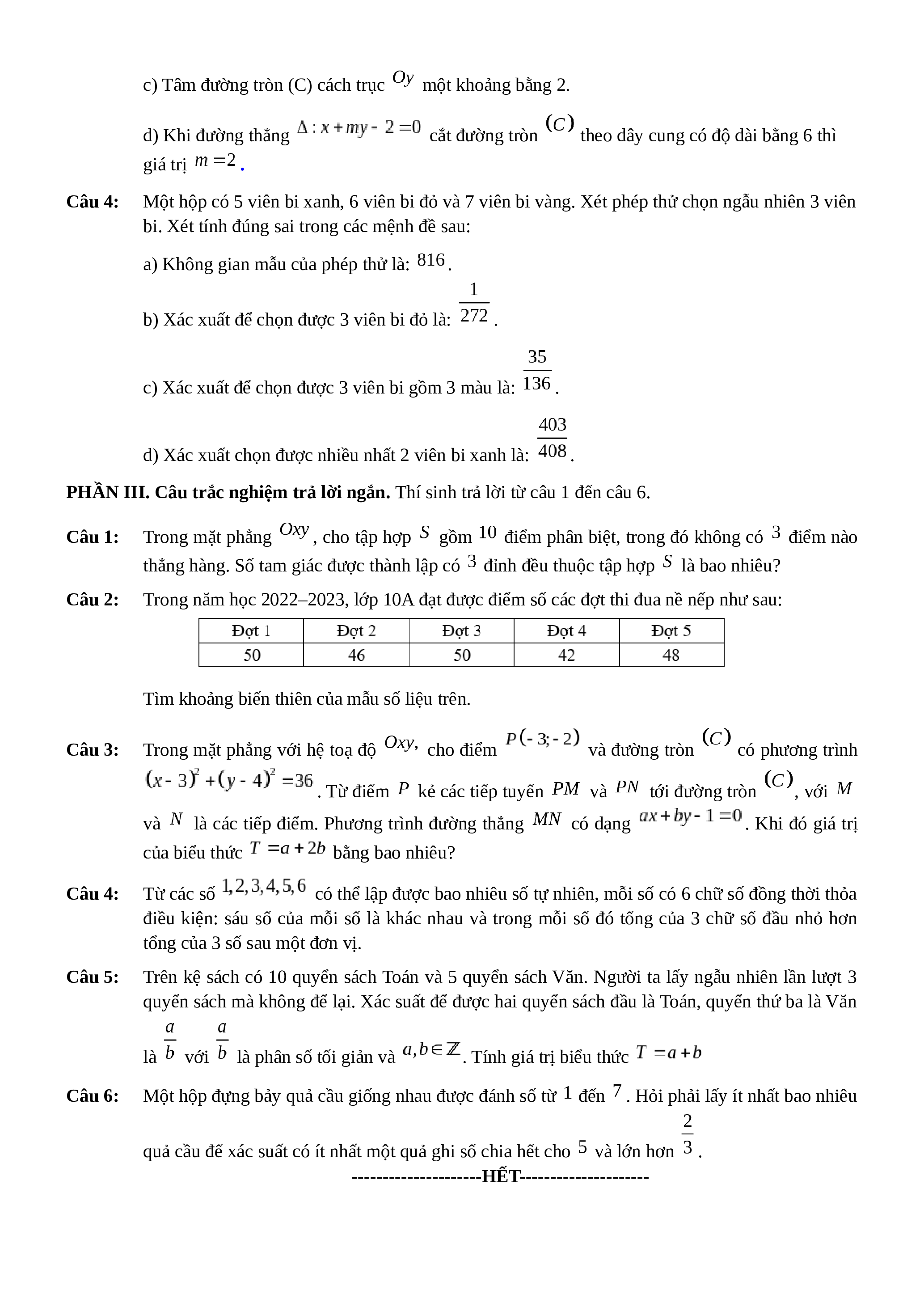 PHẦN III. Câu trắc nghiệm trả lời ngắn. Thí sinh trả lời từ câu 1 đến câu 6. Câu 1: Trong mặt phẳng , cho tập hợp gồm