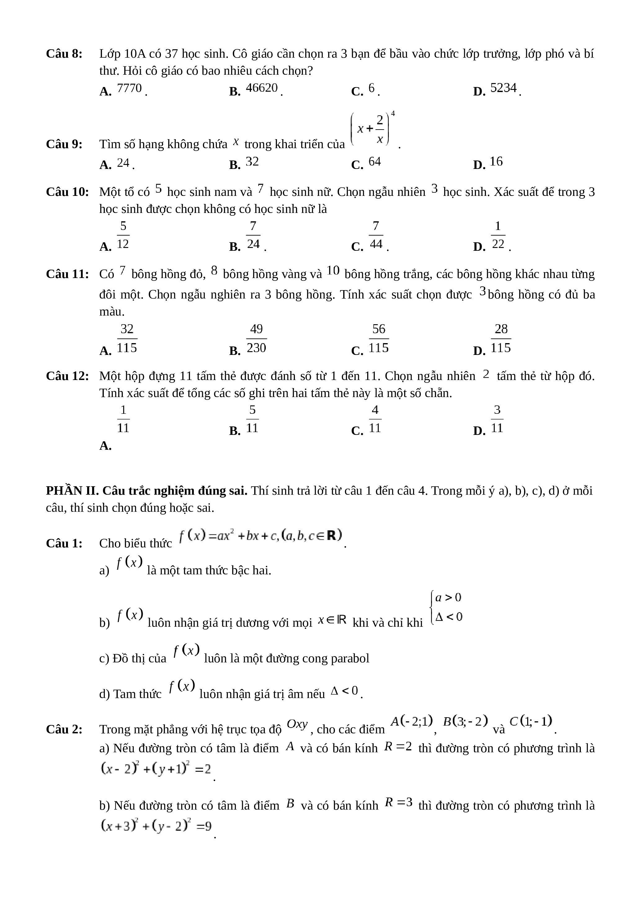 Thí sinh chỉ lựa chọn đúng chính xác 02 ý trong 1 câu hỏi được 0,25 điểm -