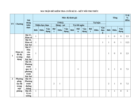 MA TRẬN ĐỀ KIỂM TRA CUỐI KÌ II – KẾT NỐI TRI THỨC Tỉ lệ Mức độ đánh giá Tổng % Nội điểm dung TNKQ Tự luận TT Chương kiến Nhiều lựa chọn Đúng - sai Trả lời ngắn thức Vận Vận Biế Vận Hiể Vận Biế Vận Biết Hiểu Hiểu Biết Hiểu dụn Biết Hiểu dụng t dụng u dụng t dụng g Bài 15. 1 1 0 0 2,5 Hàm số Bài 16. Hàm số 1 1 1 0 1 12,5 bậc hai Bài 17. Dấu Hàm số, của 1 1 0 0 2,5 đồ thị tam 1 và ứng thức dụng bậc hai Bài 18. Phương trình quy về 1 1 1 1 0 7,5 phương trình bậc hai 2 Phương Bài 19. pháp Phương tọa độ trình 2 1 2 1 0 7,5 trong đường mặt thẳng phẳng Bài 20. 1 1 1 1 0 5 Vị trí tương đối giữa hai đường thẳng. Góc và khoảng cách Bài 21. Đường tròn trong 1 1 1 2 1 0 10 mặt phẳng tọa độ Bài 22. Ba 1 1 1 1 0 12,5 đường conic Bài 23. Quy tắc 1 1 2 0 0 7,5 đếm Đại số 3 tổ hợp Bài 24. Hoán vị, 1 1 1 1 0 5 chỉnh hợp, tổ hợp Bài 25. Nhị 1 1 1 0 1 12,5 thức Newton Bài 26. Biến cố và định nghĩa 2 0 2 0 5 cổ điển của xác Tính suất xác suất Bài 27. theo 4 Thực định hành nghĩa tính cổ điển xác 2 1 0 0 3 10 suất theo định nghĩa cổ điển Tổng số câu 10 2 0 2 4 2 2 1 1 0 1 2 14 8 5 Tổng số điểm 3,0 2,0 2,0 3,0 4,0 3,0 3,0 10 Tỉ lệ % 30 20 20 30 40 30 30 100 Lưu ý: