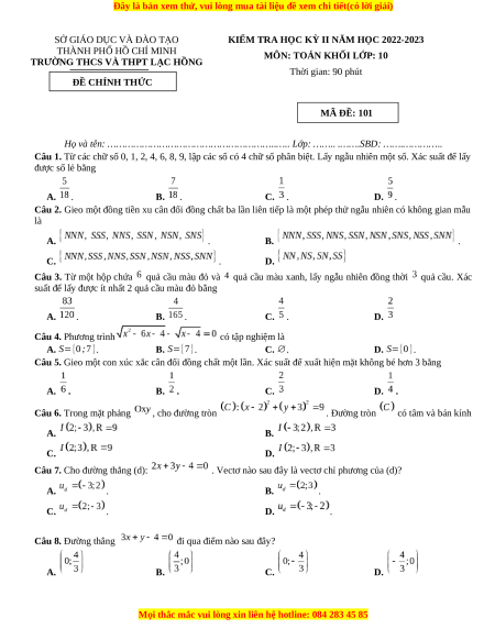 Đề thi cuối kì 2 Toán 10 năm 2024 trường THCS - THPT Lạc Hồng - Hồ Chí Minh