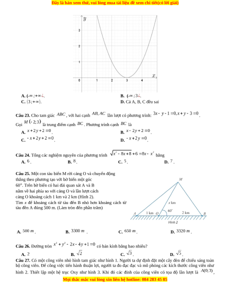Câu 27. Có một công viên nhỏ hình tam giác như hình 1. Người ta dự định đặt một cây đèn để chiếu sáng toàn