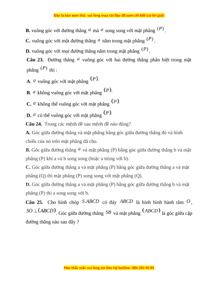 Câu 23. Đường thẳng vuông góc với hai đường thẳng phân biệt trong mặt phẳng thì :