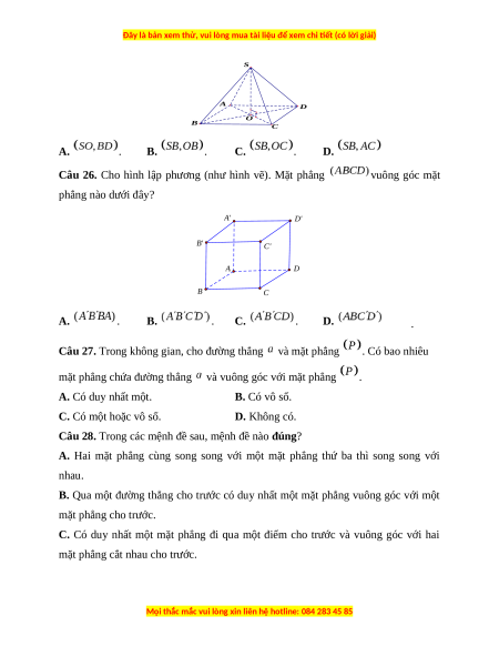 Câu 21. Qua điểm O cho trước, có bao nhiêu mặt phẳng vuông góc với đường thẳng cho trước? A. 2. B. 3. C. Vô số. D. 1.