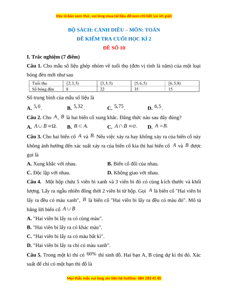 ĐỀ KIỂM TRA CUỐI HỌC KÌ 2 ĐỀ SỐ 10