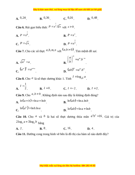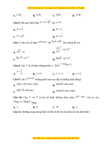 Câu 8. Cho là số thực dương khác 1. Tính . A. . B. . C. . D. . Câu 9. Cho