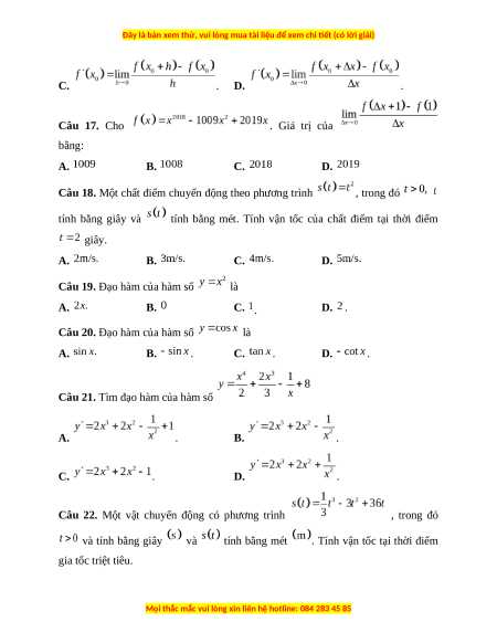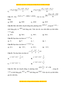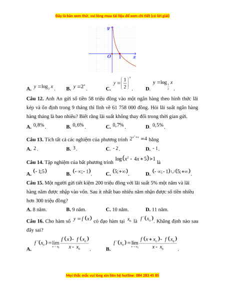 hàng năm được nhập vào vốn. Sau ít nhất bao nhiêu năm nhận được số tiền nhiều hơn 300 triệu đồng? A. 8 năm. B. 9 năm. C. 10 năm. D. 11 năm. Câu 16. Cho hàm số có đạo hàm tại là . Khẳng định nào sau đây sai? A. . B. .