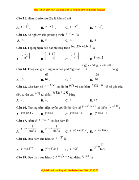 Câu 14. Tổng các giá trị nghiệm của phương trình bằng A. . B. . C. . D. . Câu 15. Cho hàm số có đồ thị và đạo hàm Hệ số góc của tiếp tuyến của tại điểm bằng A. . B. . C. . D. .