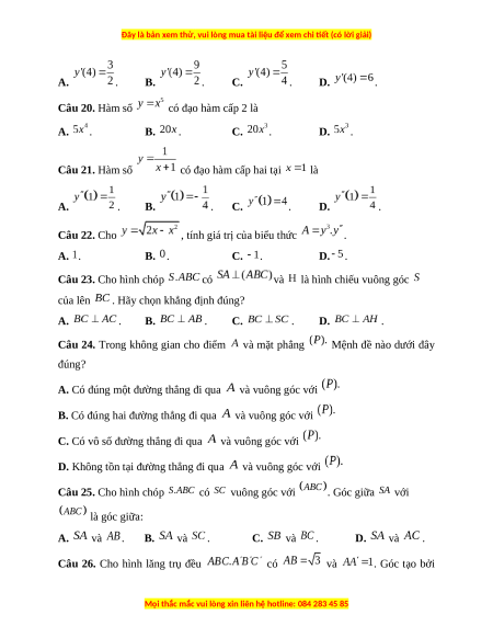 có đạo hàm cấp 2 là A. . B. . C. . D. . Câu 21. Hàm số