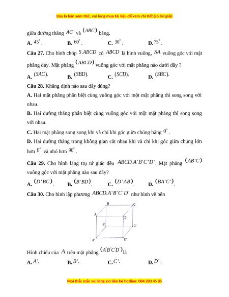 Câu 25. Cho hình chóp S.ABC có SC vuông góc với ABC. Góc giữa SA với