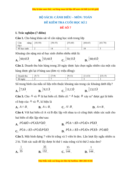 ĐỀ KIỂM TRA CUỐI HỌC KÌ 2 ĐỀ SỐ 7