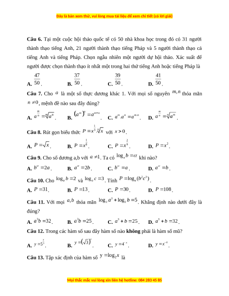 Câu 6. Tại một cuộc hội thảo quốc tế có 50 nhà khoa học trong đó có 31 người