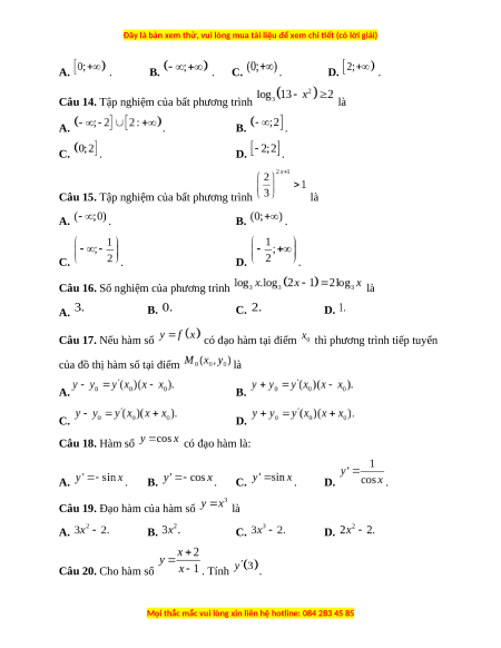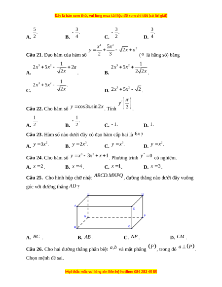 Câu 23. Hàm số nào dưới đây có đạo hàm cấp hai là ? A. B. C. D. Câu 24. Cho hàm số . Phương trình có nghiệm. A. . B. . C. . D. .