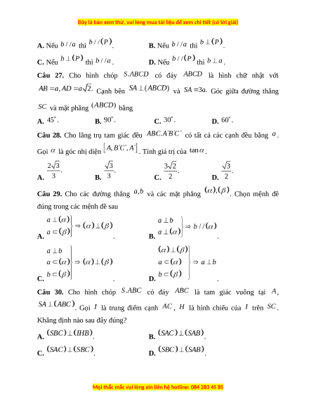 Câu 26. Cho hai đường thẳng phân biệt và mặt phẳng , trong đó . Chọn mệnh đề sai.