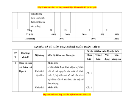 đơn vị kiến thức Nhận biết Thông hiểu Vận dụng Vận dụng cao % điểm TN TL TN TL TN TL TN TL Phép tính luỹ thừa, phép tính lôgarit và các