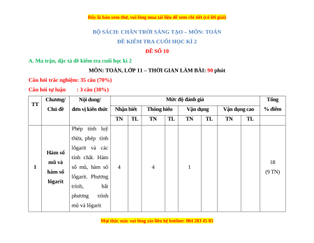 - Tailieugiaovien.com.vn giới thiệu bộ 10 đề cuối kì 2 gồm đầy đủ ma trận và lời giải chi tiết môn Toán 11 bộ Chân trời sáng tạo mới nhất năm 2023 - 2024 nhằm giúp Giáo viên có thêm tài liệu tham khảo ra đề thi Toán lớp 11.
