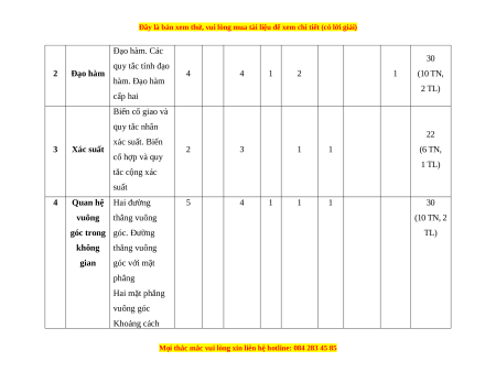Đạo hàm. Các 30 quy tắc tính đạo 2 Đạo hàm 4 4 1 2 1 (10 TN, hàm. Đạo hàm 2 TL) cấp hai Biến cố giao và quy tắc nhân 22 xác suất. Biến 3 Xác suất 2 3 1 1 (6 TN, cố hợp và quy 1 TL) tắc cộng xác suất 4