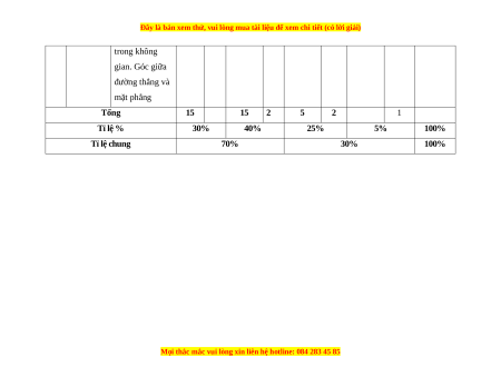 trong không gian. Góc giữa đường thẳng và mặt phẳng Tổng 15 15 2 5 2 1 Tỉ lệ % 30% 40% 25% 5% 100% Tỉ lệ chung 70% 30% 100%
