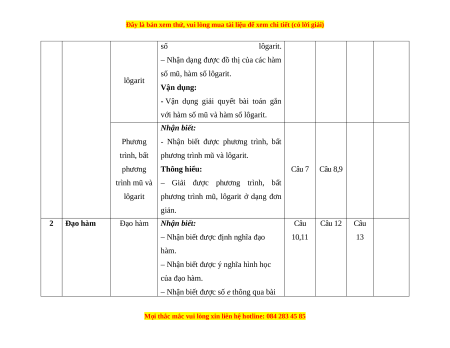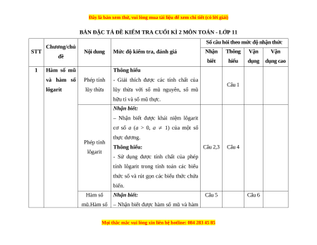 đơn vị kiến thức Nhận biết Thông hiểu Vận dụng Vận dụng cao % điểm TN TL TN TL TN TL TN TL Phép tính luỹ thừa, phép tính lôgarit và các