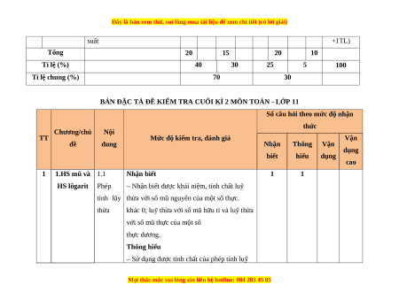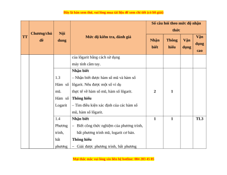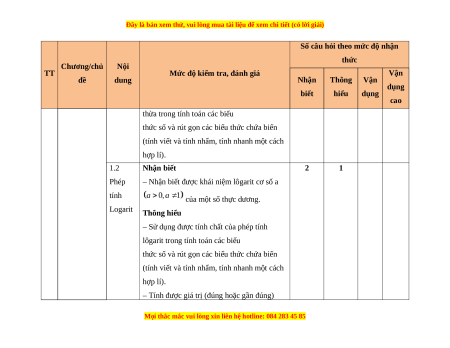 Mức độ kiểm tra, đánh giá Vận đề dung Nhận Thông Vận dụng biết hiểu dụng cao 1 1.HS mũ và 1.1 Nhận biết 1 1 HS lôgarit Phép