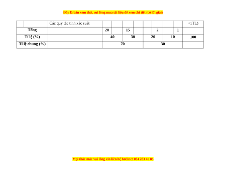 Các quy tắc tính xác suất +1TL) Tổng 20 15 2 1 Tỉ lệ (%) 40 30 20 10 100 Tỉ lệ chung (%) 70 30