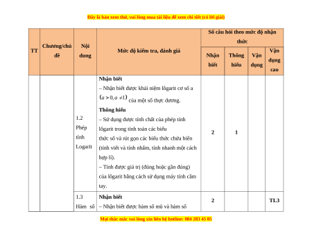 Mức độ kiểm tra, đánh giá Vận đề dung Nhận Thông Vận dụng biết hiểu dụng cao 1 1.HS mũ và 1.1 Nhận biết 1 1 HS lôga rit Phép