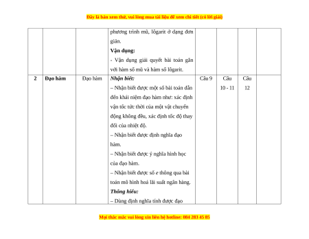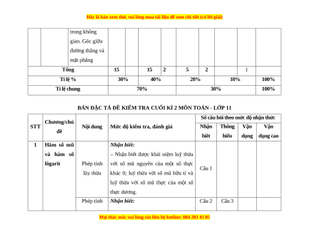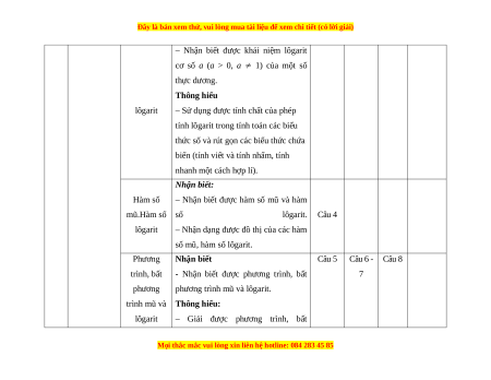 đơn vị kiến thức Nhận biết Thông hiểu Vận dụng Vận dụng cao % điểm TN TL TN TL TN TL TN TL Phép tính luỹ thừa, phép tính lôgarit và các