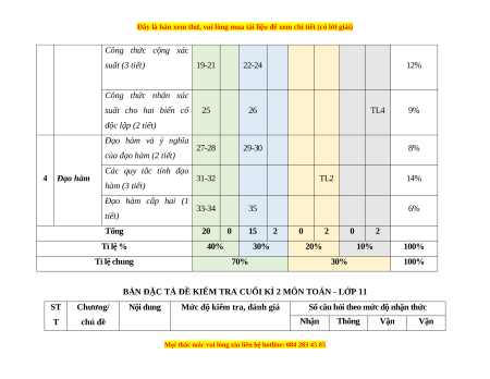 Đạo hàm cấp hai (1 33-34 35 6% tiết) Tổng 20 0 15 2 0 2 0 2 Tỉ lệ % 40% 30% 20% 10% 100% Tỉ lệ chung 70% 30% 100%