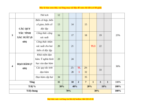 biến cố độc lập Khái niệm đạo hàm. Ý nghĩa hình 23 24 ĐẠO HÀM (7 học của đạo hàm 4 36% tiết) Các quy tắc tính 25- TL 29- 33 đạo hàm 28 1 32 Đạo hàm cấp hai 34 35 Tổng 15 10 2 7 1 3 1 100% Tỉ lệ % 30% 40% 20% 10% 100% Tỉ lệ chung 70% 30% 100%