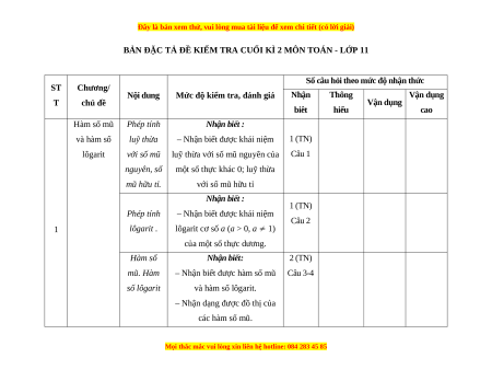 BẢN ĐẶC TẢ ĐỀ KIỂM TRA CUỐI KÌ 2 MÔN TOÁN - LỚP 11