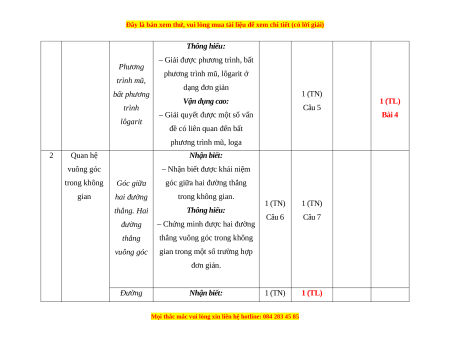 Hàm số mũ. Hàm 3-4 số lôgarit Phương trình mũ, bất phương trình 5 TL4 lôgarit 2 QUAN HỆ Góc giữa hai 24% VUÔNG đường thẳng. Hai 6 7 GÓC đường thẳng TRONG vuông góc KHÔNG Đường thẳng TL GIAN (17 tiết)