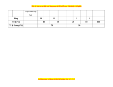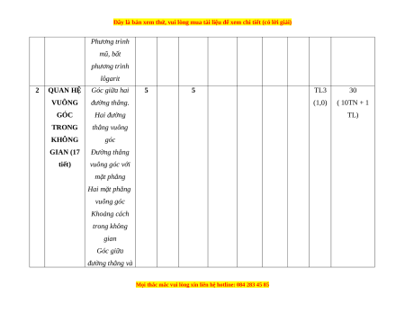 Phương trình mũ, bất phương trình lôgarit 2 QUAN HỆ Góc giữa hai 5 5 TL3 30 VUÔNG đường thẳng. (1,0) ( 10TN + 1 GÓC Hai đường TL) TRONG thẳng vuông KHÔNG góc GIAN (17 Đường thẳng tiết) vuông góc với mặt phẳng Hai mặt phẳng vuông góc Khoảng cách trong không gian Góc giữa đường thẳng và