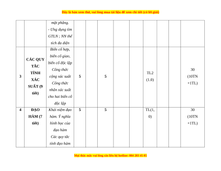 CÁC QUY biến cố độc lập TẮC Công thức 30 TÍNH TL2 3 cộng xác suất 5 5 (10TN XÁC (1.0) Công thức +1TL) SUẨT (9 nhân xác suất tiết) cho hai biến cố độc lập 4 ĐẠO Khái niệm đạo 5 5 TL(1, 30 HÀM (7 hàm. Ý nghĩa 0) (10TN tiết) hình học của +1TL) đạo hàm Các quy tắc tính đạo hàm