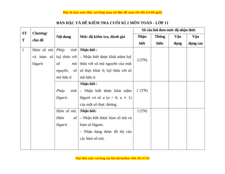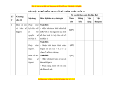 Mức độ nhận thức Vận dụng Tổng % TT Chủ đề Nội dung Nhận biết Thông hiểu Vận dụng cao điểm TN TL TN TL TN TL TN TL 1 HÀM SỐ Phép tính luỹ 5 10 MŨ VÀ thừa với số mũ ( 5TN) HÀM SỐ nguyên, số mũ LÔGARIT hữu tỉ. (8 tiết) Phép tính lôgarit . Hàm số mũ. Hàm số lôgarit