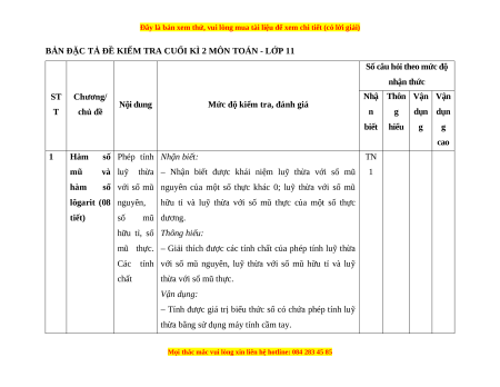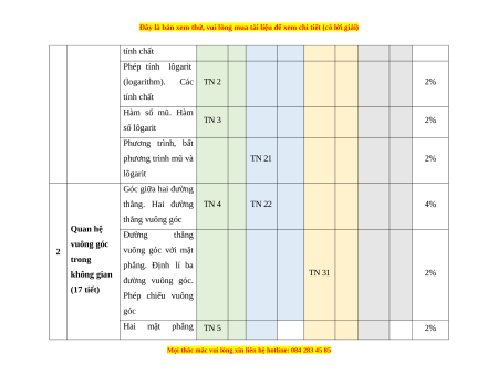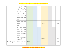 tính chất Phép tính lôgarit (logarithm). Các TN 2 2% tính chất Hàm số mũ. Hàm TN 3 2% số lôgarit Phương trình, bất phương trình mũ và TN 21 2% lôgarit Góc giữa hai đường thẳng. Hai đường TN 4 TN 22 4% thẳng vuông góc Quan hệ Đường thẳng vuông góc 2 vuông góc với mặt trong phẳng. Định lí ba không gian TN 31 2% đường vuông góc. (17 tiết) Phép chiếu vuông góc Hai mặt phẳng TN 5 2%