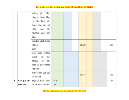 vuông góc. Hình lăng trụ đứng, lăng trụ đều, hình hộp đứng, hình hộp chữ nhật, hình lập phương, hình chóp đều. Khoảng cách trong không TN 32 2% gian Góc giữa đường thẳng và mặt phẳng. Góc nhị diện và góc phẳng nhị diện Hình chóp cụt đều TN 33 2% và thể tích 3