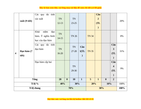 Các quy tắc tính Câu xác suất TN TN 2 suất (9 tiết) 20% 12-13 23-25 (TL ) Khái niệm đạo TN hàm. Ý nghĩa hình TN 26 TN 34 8% 14-15 học của đạo hàm Các quy tắc tính Câu TN Câu đạo hàm TN 3 Đạo hàm (7 27-28 1(TL TN 35 31% 4 16-20 (TL tiết) ) ) Đạo hàm cấp hai Câu TN 4 9% 29-30 (TL ) Tổng 20 0 10 1 5 1 0 2 Tỉ lệ % 40% 30% 20% 10% 100% Tỉ lệ chung 70% 30% 100%