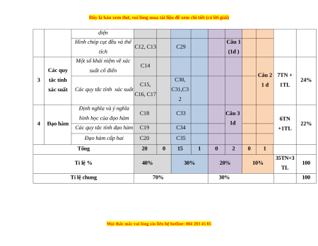Các quy tắc tính đạo hàm C19 C34 +1TL Đạo hàm cấp hai C20 C35 Tổng 20 0 15 1 0 2 0 1 35TN+3 Tỉ lệ % 40% 30% 20% 10% 100 TL Tỉ lệ chung 70% 30% 100
