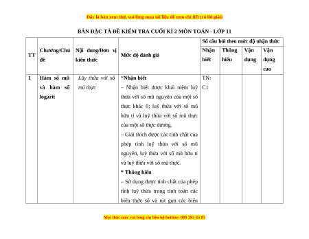 Chương/Chủ Nội dung/Đơn vị Nhận Thông Vận Vận TT Mức độ đánh giá đề kiến thức biết hiểu dụng dụng cao 1 Hàm số mũ