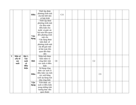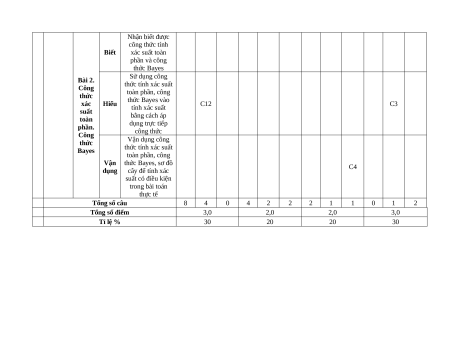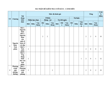 MA TRẬN ĐỀ KIỂM TRA CUỐI KÌ II – CÁNH DIỀU Tỉ lệ Mức độ đánh giá Tổng % Nội điểm dung TNKQ Tự luận TT Chương kiến Nhiều lựa chọn Đúng - sai Trả lời ngắn thức Vận Vận Biế Vận Hiể Vận Biế Vận Biết Hiểu Hiểu Biết Hiểu dụn Biết Hiểu dụng t dụng u dụng t dụng g Bài 1. Nguyên hàm Bài 2. Nguyên 2 2 2 2 0 10 hàm của một số Nguyên hàm số hàm. sơ cấp 1 Tích Bài 3. phân Tích 2 2 0 0 5 phân Bài 4. Ứng dụng hình 2 1 2 0 1 15 học của tích phân Phương Bài 1. trình Phương 2 mặt trình 2 2 2 0 2 10 phẳng, mặt đường phẳng Bài 2. Phương trình 1 2 1 1 2 1 17,5 thẳng, đường mặt cầu thẳng trong không gian Bài 3. Phương trình 1 2 1 3 1 0 12,5 mặt cầu Bài 1. Một số Xác 3 yếu tố suất có 1 1 1 2 1 0 12,5 xác suất điều kiện Bài 2. Công thức xác suất 1 1 1 0 2 1 17,5 toàn phần. Công thức Bayes Tổng số câu 8 4 0 4 2 2 2 1 1 0 1 2 14 8 5 Tổng số điểm 3,0 2,0 2,0 3,0 4,0 3,0 3,0 10 Tỉ lệ % 30 20 20 30 40 30 30 100 Lưu ý: