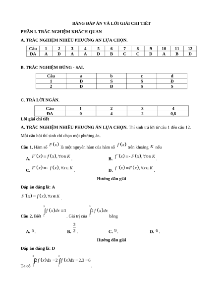 là một nguyên hàm của hàm số trên khoảng nếu A. . B. . C. . D. . Câu 2. Biết . Giá trị của bằng A. . B. . C. . D. .