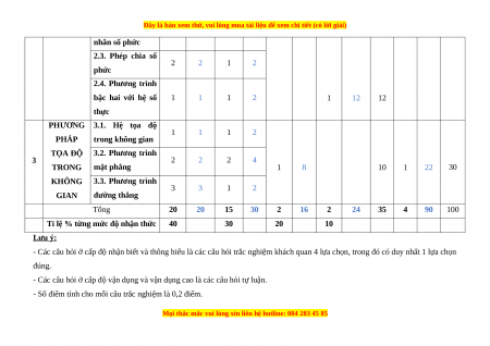 PHƯƠNG 3.1. Hệ tọa độ 1 1 1 2 PHÁP trong không gian TỌA ĐỘ 3.2. Phương trình 3 2 2 2 4 TRONG mặt phẳng 1 8 10 1 22 30 KHÔNG 3.3. Phương trình 3 3 1 2 GIAN đường thẳng Tổng 20 20 15 30 2 16 2 24 35 4 90 100