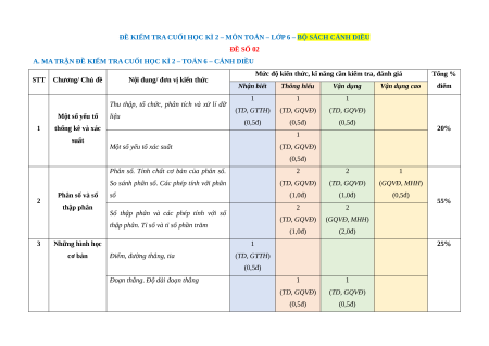 A. MA TRẬN ĐỀ KIỂM TRA CUỐI HỌC KÌ 2 – TOÁN 6 – CÁNH DIỀU