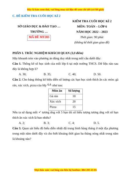 Câu 1. Thống kê số học sinh của mỗi lớp 6 tại một trường THCS. Dữ liệu nào sau đây là không hợp lí? A. 30; B. 35; C. 40; D. 50.