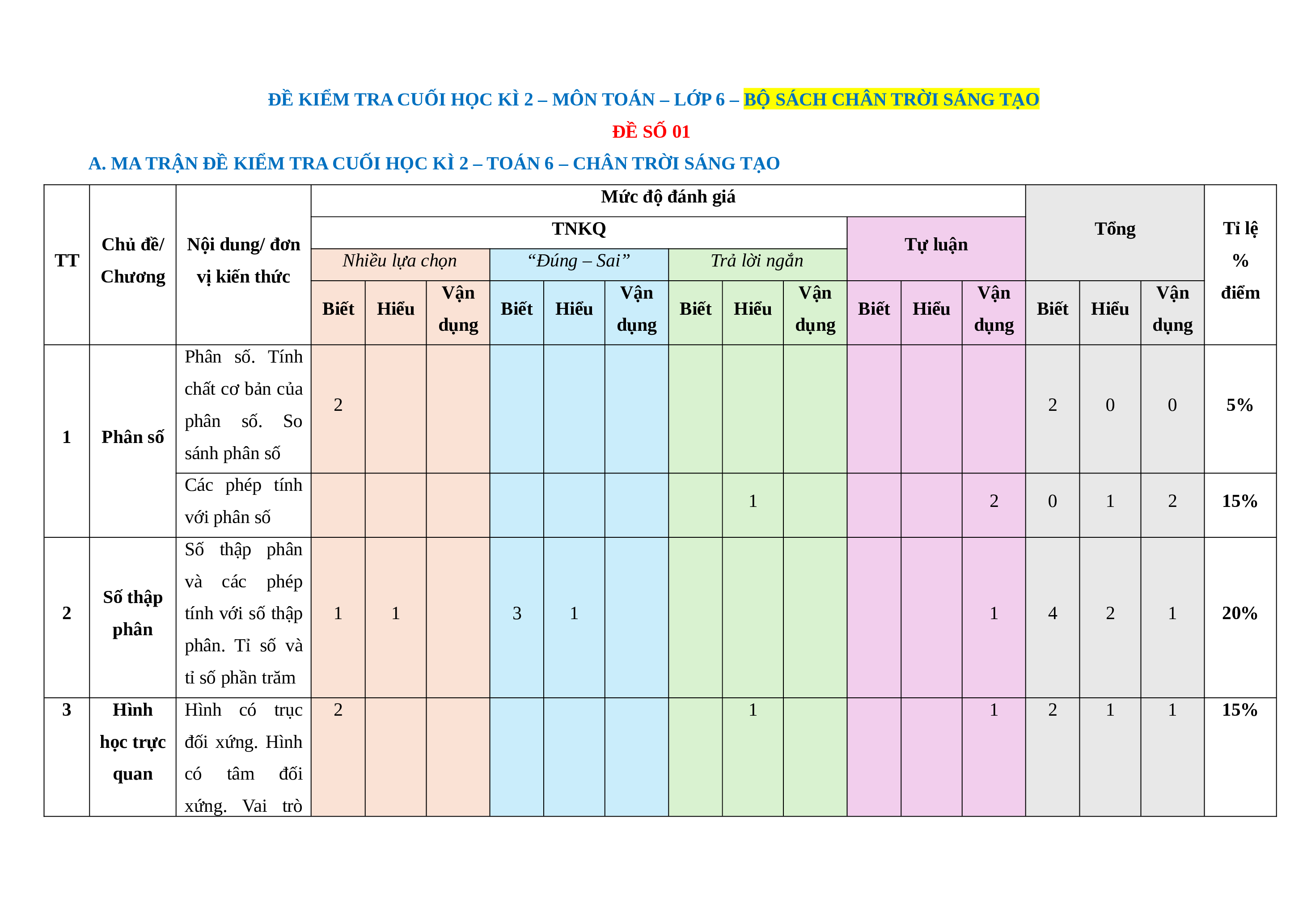 A. MA TRẬN ĐỀ KIỂM TRA CUỐI HỌC KÌ 2 – TOÁN 6 – CHÂN TRỜI SÁNG TẠO Mức độ đánh giá TNKQ Tổng Tỉ lệ