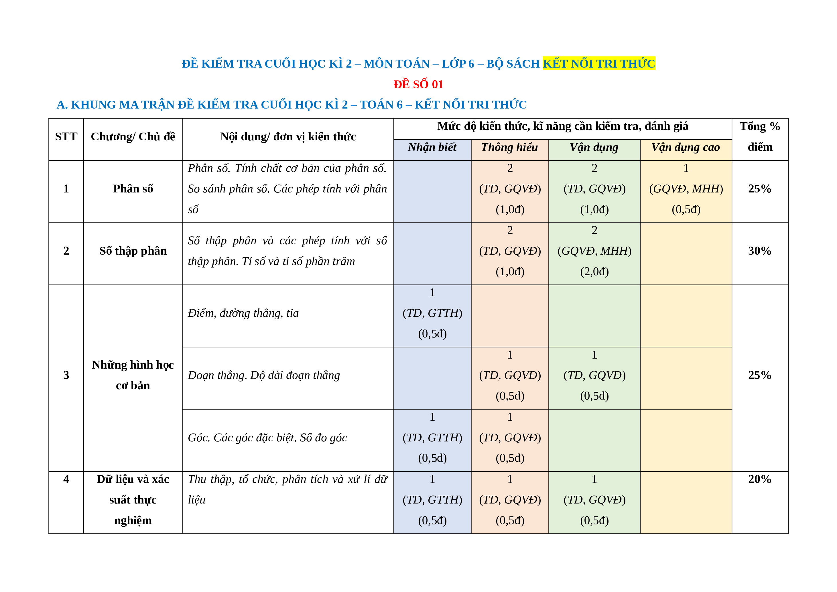 A. KHUNG MA TRẬN ĐỀ KIỂM TRA CUỐI HỌC KÌ 2 – TOÁN 6 – KẾT NỐI TRI THỨC